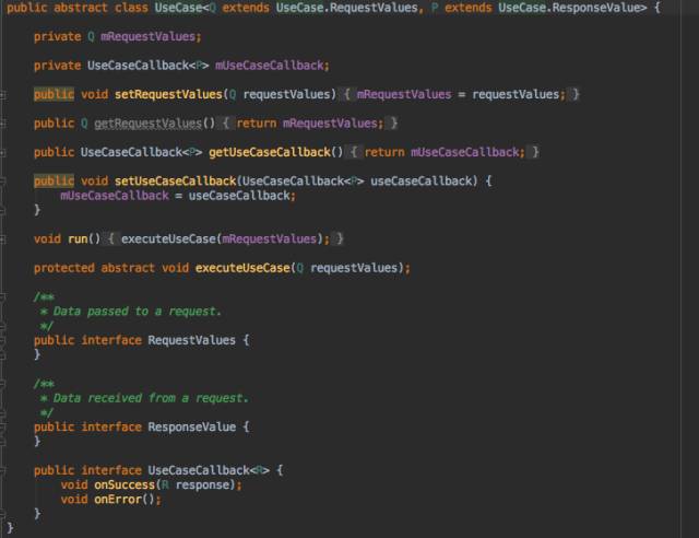 其中泛型需要使用RequestValues和ResponseValue时要注意,然后其里面有UseCallBack的回调接口,并提供Get和Set的方法,而run的方法需要调用抽象excuteUseCase的方法,需要父类实现。