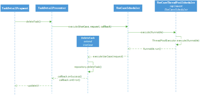 在其他资料里找到clean架构一个deleteTask的一个时序图,其基本的流程都是一致。