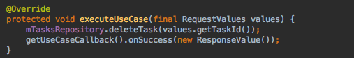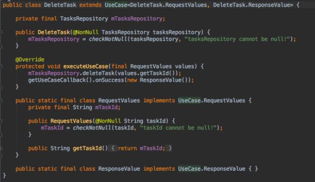 然后DeleteTask里面可以看到有一些MVP架构的taskRepository的操作,覆写了excuteUseCase方法,然后还需要继承RequestValues和ResponseValue创建两个静态的类