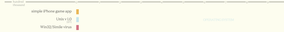 最上面是一个简单的 iPhone 应用,代码行数还不到 10w,后面紧接着的是 UNIX 1.0 和 Win32