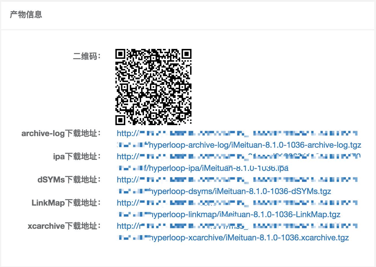 同样,Hyperloop 在集成时所收集的信息,都会展示出来。不同于组件发布,集成后有诸多产物,各位 RD 可能会有下载需求,我们还会把所有的产物都打包上传到美团云上,提供下载链接。