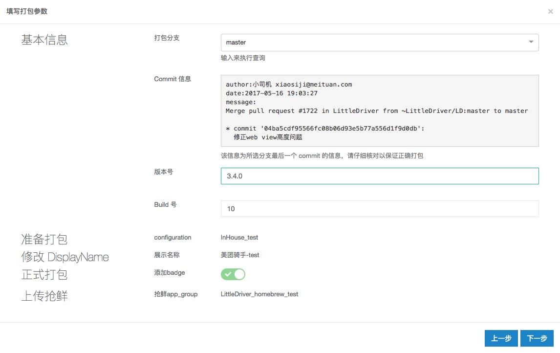 除了集成,我们还有个很重要的功能就是打包。作为一些小一点的业务方,自己并没有什么集成的需求,而更多的是希望能够按照自己的需求来打一个包出来。例如用于验证功能的 feature test,用户每日构建的 daily build,或者说用于提交 iTC(iTunes Connect) 的 App Store build。