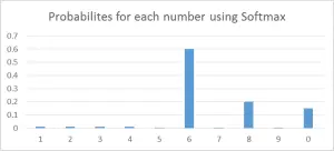 以这种方式来操作的话,我们很容易看到——假设你正在尝试识别一个可能看起来像8的6。该函数将为每个数字分配值如下。我们可以很容易地看出,最高概率被分配给6,而下一个最高概率分配给8,依此类推……