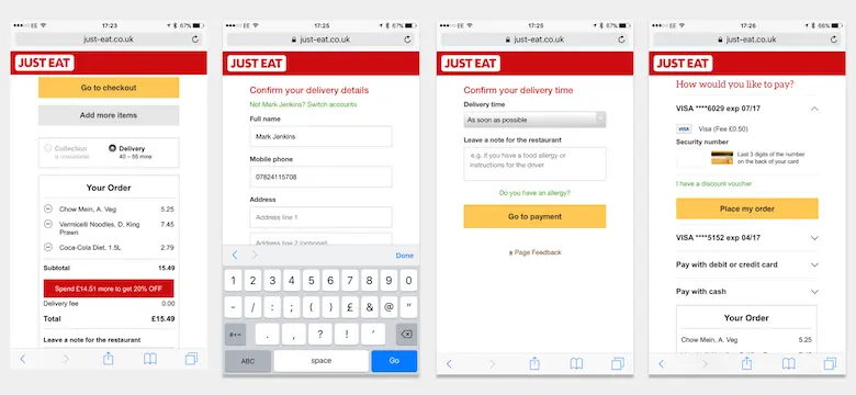 Just Eat的结账分为多个页面。我们还在设计中进一步简化了支付页面:用户先选择“现金支付”或“银行卡支付”,然后才会转到相关的页面。可惜我们并没有对这项优化进行测试。
