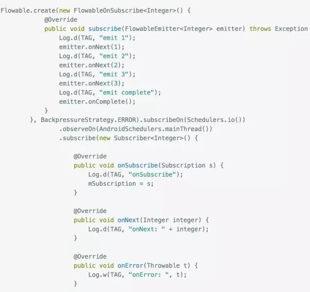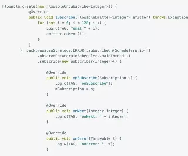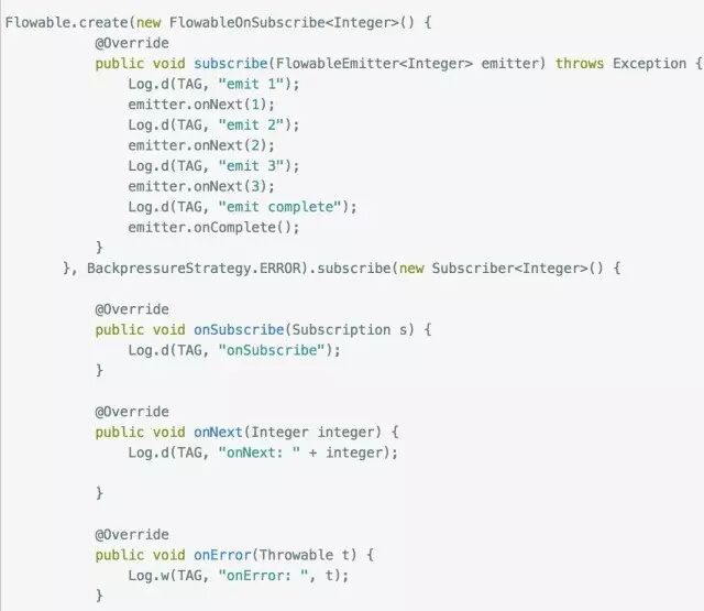 我们注意到这次和Observable有些不同. 首先是创建Flowable的时候增加了一个参数, 这个参数是用来选择背压,也就是出现上下游流速不均衡的时候应该怎么处理的办法, 这里我们直接用BackpressureStrategy.ERROR这种方式, 这种方式会在出现上下游流速不均衡的时候直接抛出一个异常,这个异常就是著名的MissingBackpressureException. 其余的策略后面再来讲解.