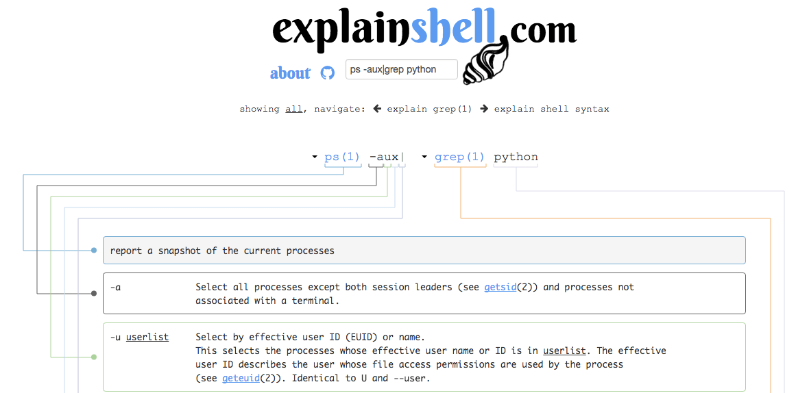 15、explainshell:一个可以解析 Linux 命令的网站,它可以给出命令的解释和其参数的解释,例如:ps -aux|grep python,在线演示