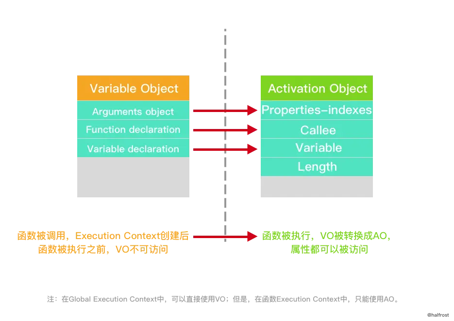 VO 和 AO 的关系可以理解为,VO 在不同的 Execution Context 中会有不同的表现:当在 Global Execution Context 中,直接使用的 VO;但是,在函数 Execution Context 中,AO 就会被创建。