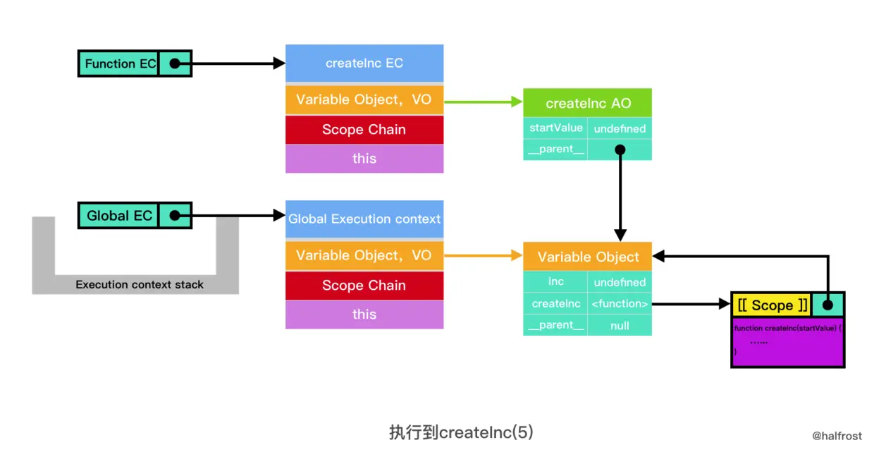 当 createInc 函数执行的最后,并退出的时候,Global VO中的 inc 就会被设置;这里需要注意的是,虽然 create Execution Context 退出了执行上下文栈,但是因为 inc 中的成员仍然引用 createInc AO(因为 createInc AO 是 function(step) 函数的 parent scope ),所以 createInc AO 依然在 Scope 中。