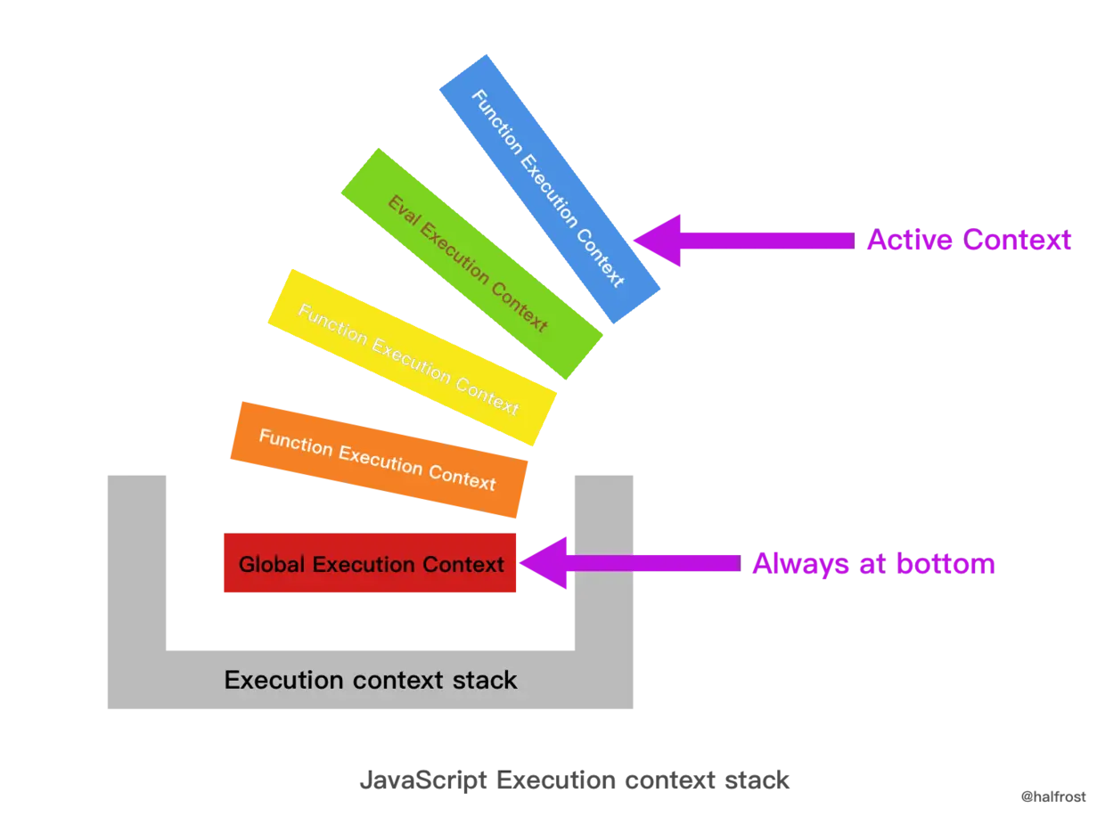 JavaScript 引擎会以堆栈的方式来处理它们,这个堆栈,我们称其为函数调用栈(call stack)。栈底永远都是全局上下文,而栈顶就是当前正在执行的上下文。