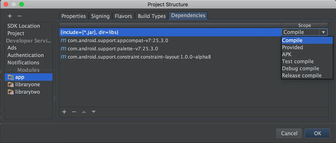 打开 Project Structure,查看 Modules 的 Dependencies 内容时,可以看到每一个依赖项的右边有个 Scope 选项: