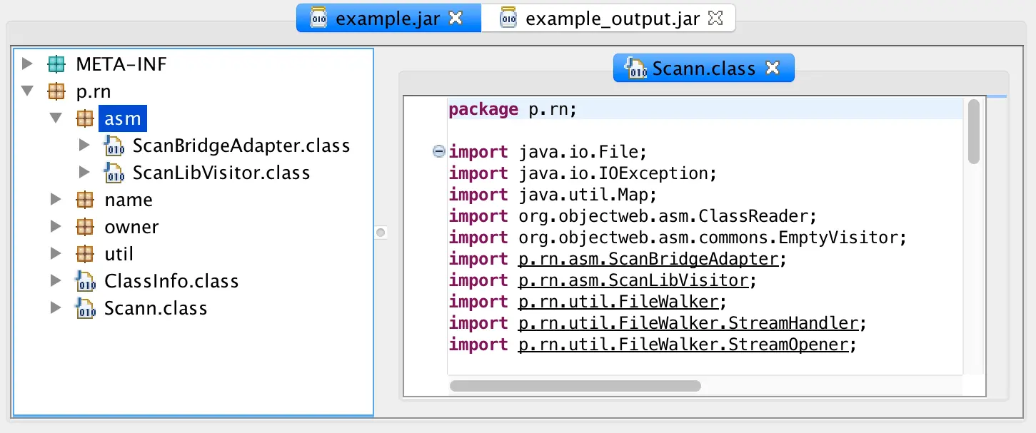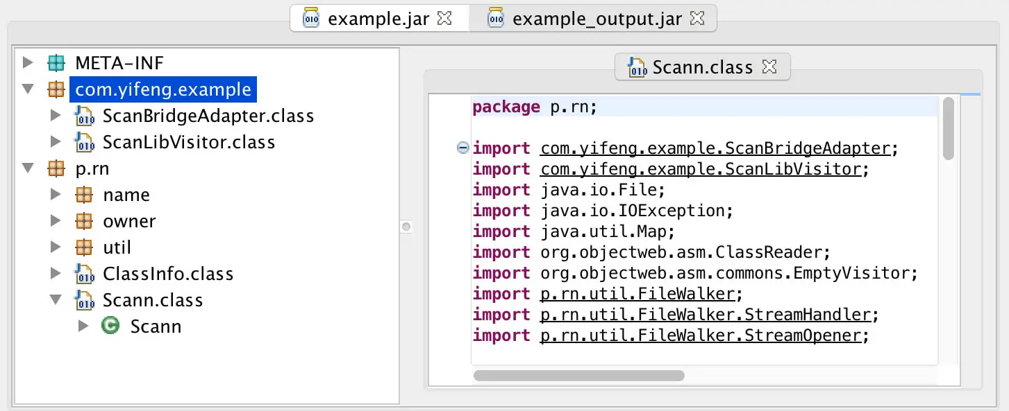 rule p.rn.asm.** com.yifeng.example.@1我们看一下重命名前后 Jar 包内容的代码对比图: