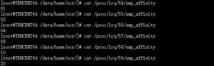 CPU 亲和性:每个中断号配置只有一个cpu进行处理,其中的值:01,02,04等为16进制,相应bit为1的值代码cpu的编号。