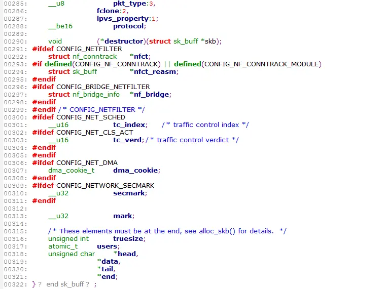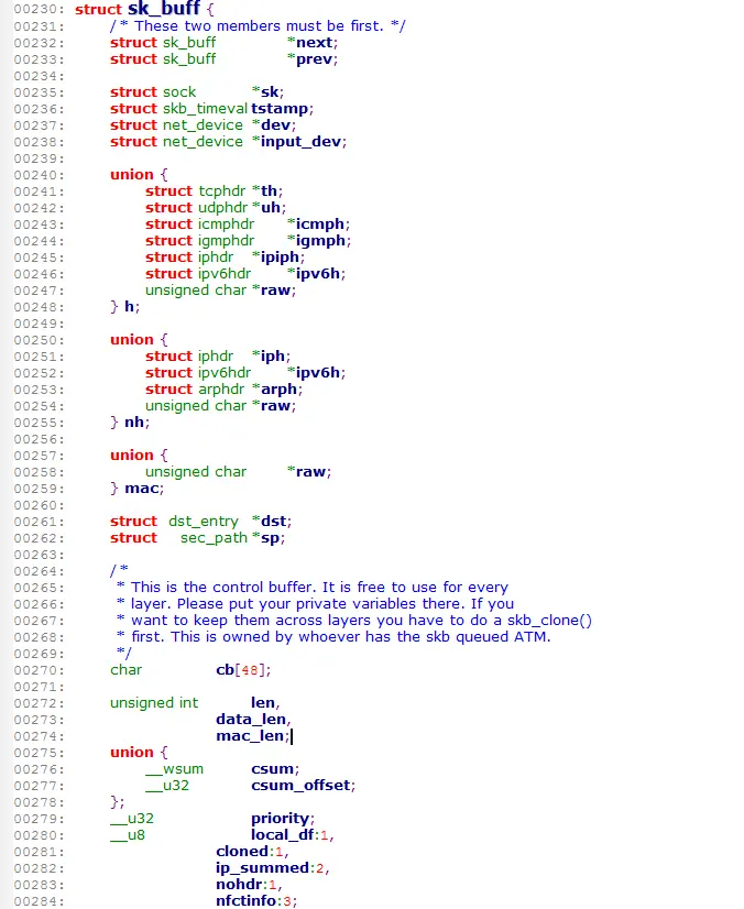 sk_buff结构是Linux网络模块中最重要的数据结构之一。sk_buff可以在不同的网络协议层之间传递,为了适配不同的协议,里面的大多数成员都是指针,还有一些union,其中data指针和len会在不同的协议层中发生改变,在收包流程中,即数据向上层传递时,下层的首部就不再需要了。图2即演示了数据包发送时指针和len的变化情况。(linux源码不同的版本有些差别,下面的截图来自linux 2.6.20)。