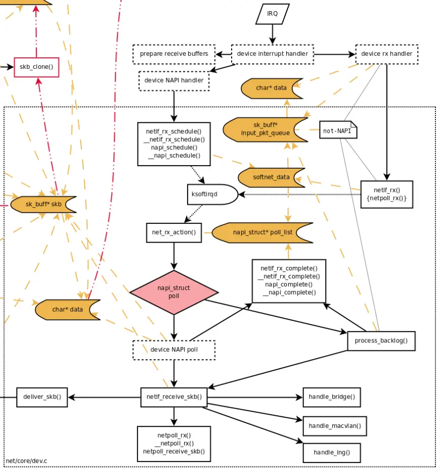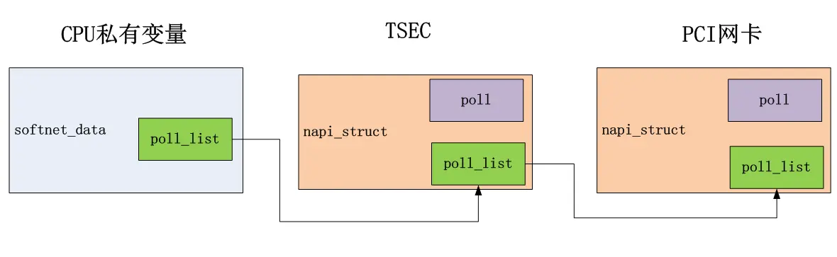 每个网络设备(MAC层)都有自己的net_device数据结构,这个结构上有napi_struct。每当收到数据包时,网络设备驱动会把自己的napi_struct挂到CPU私有变量上。这样在软中断时,net_rx_action会遍历cpu私有变量的poll_list,执行上面所挂的napi_struct结构的poll钩子函数,将数据包从驱动传到网络协议栈。