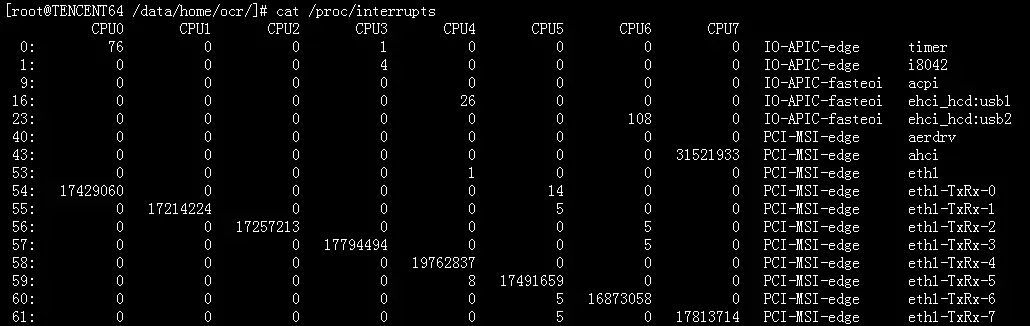 MSI-X :一个设备可以产生多个中断,如下图中的54-61号中断eth1-TxRx-[0-7],实际是eth1网卡占用的中断号。