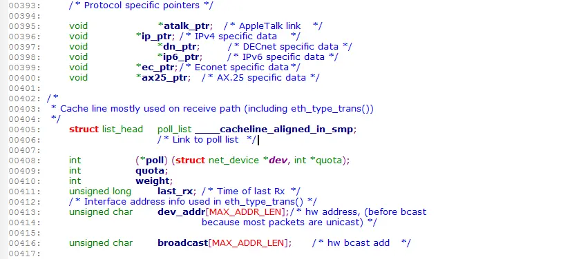 net_device代表的是一种网络设备,既可以是物理网卡,也可以是虚拟网卡。在sk_buff中有一个net_device * dev变量,这个变量会随着sk_buff的流向而改变。在网络设备驱动初始化时,会分配接收sk_buff缓存队列,这个dev指针会指向收到数据包的网络设备。当原始网络设备接收到报文后,会根据某种算法选择某个合适的虚拟网络设备,并将dev指针修改为指向这个虚拟设备的net_device结构。