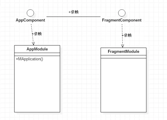 @Component声明FrgamentComponent是组件集, modules声明引用了FragmentModule.class这个组件,而dependencies就是我们需要注意的,依赖于另一个组件集,在此我们依赖的是上面的AppComponent组件集