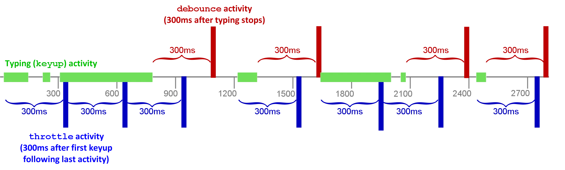 二者顾名思义,防抖(debounce)的含义便是为了防止抖动造成的结果不准确,我们在抖动的过程中不去关注其中的变化,而是等到稳定的时候再处理结果。这种概念在硬件上一些电流或者电磁波图有着很多的应用。在电流中一般会有毛刺,而我们在计算结果的时候是不会去考虑这段异常的抖动,而是从整体上来评测结果,而在软件上来实现防抖,便是在抖动的过程中不去执行对应的动作,而是等到抖动结束趋于稳定的时候再来执行动作。