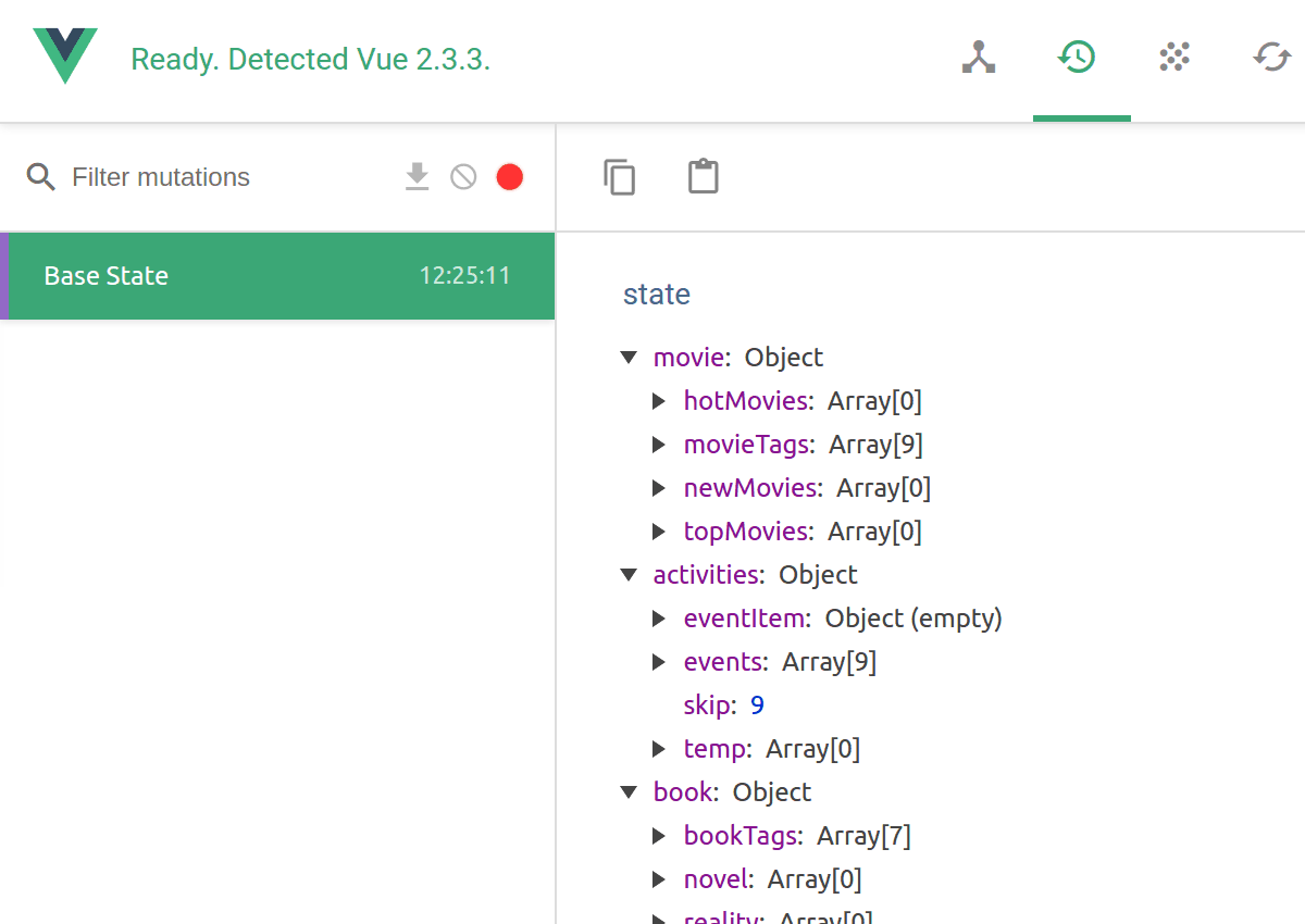 稍微吐槽一下本项目:除了用户模块和搜索模块的状态之外,其他的状态是没有必要一定使用Vuex的。电影数据,图书数据,小组数据等是一次性数据,什么时候访问就什么时候呈现,顶多会通过路由传递一些必要的参数。即是说,其他视图不依赖这些数据,它本身也不需要来自其他视图的状态,并且这些状态并不影响全局状态。这个时候你不必使用Vuex。但你这里使用了,作何解释呢?的确,Vuex很酷,我想试试。没别的理由。我能清楚明了的查看每一个组件的状态,掌控全局,这的确很酷。