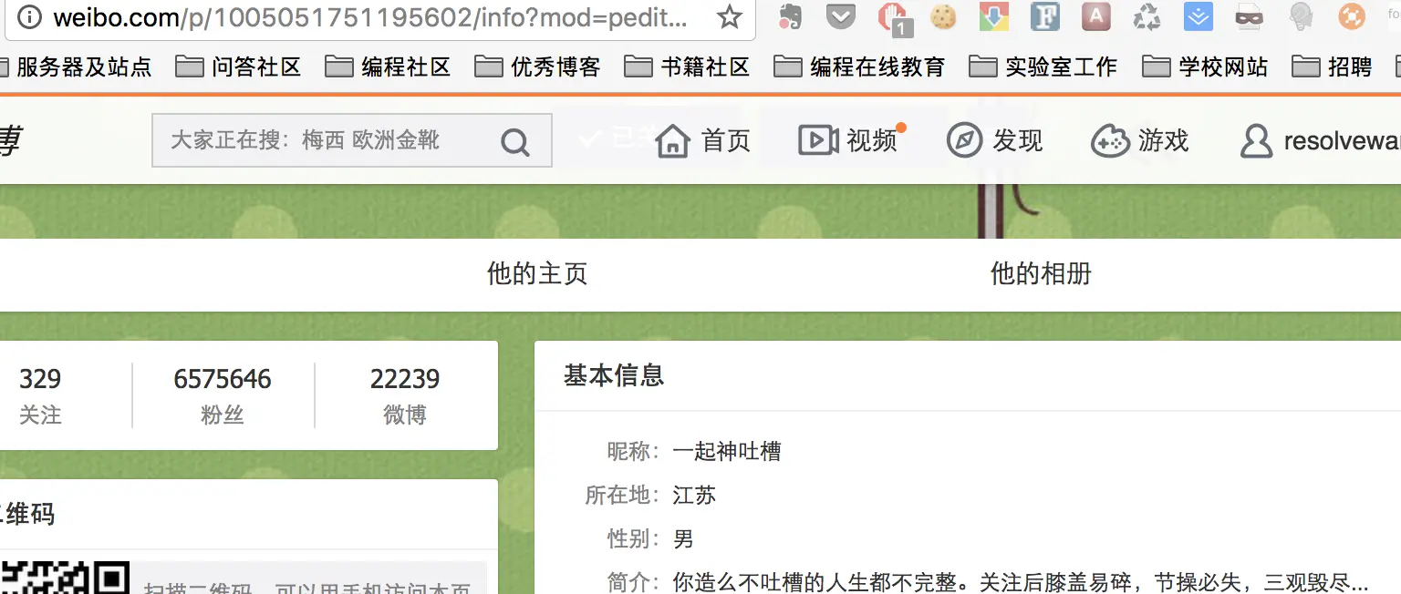 我们先来分析如何构造用户信息的URL。这里我以微博名为一起神吐槽的博主为例进行分析。做爬虫的话,一个很重要的意识就是爬虫能抓的数据都是人能看到的数据,反过来,人能在浏览器上看到的数据,爬虫几乎都能抓。这里用的是几乎,因为有的数据抓取难度特别。我们首先需要以正常人的流程看看怎么获取到用户的信息。我们先进入该博主的主页,如下图