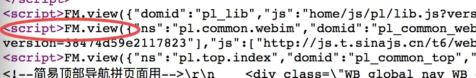下面讲页面解析的分析。有一些做PC端微博信息抓取的同学,可能曾经遇到过这么个问题:保存到本地的html文件打开都能看到所有信息啊,为啥在页面源码中找不到呢?因为PC端微博页面的关键信息都是像下图这样,被FM.view()包裹起来的,里面的数据可能被json encode过。