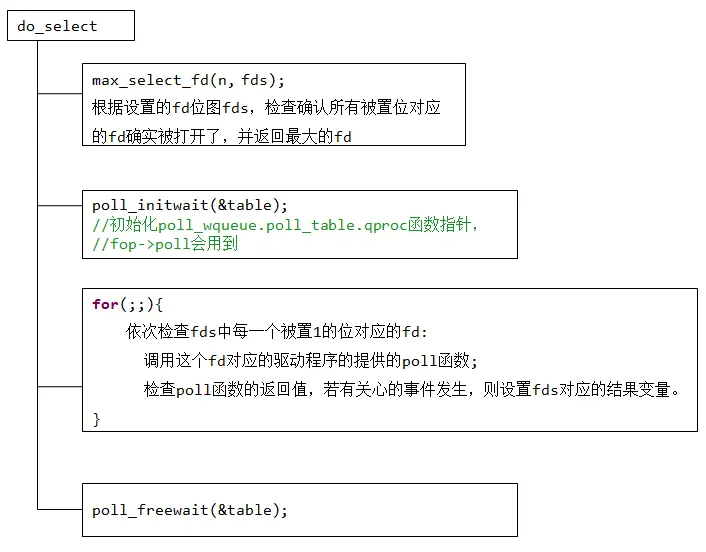 用户空间在调用select库函数之后,最终会陷入内核态调用系统调用函数(sys_select),如果对系统调用原理感兴趣的可以看我的另一篇文章从glibc源码看系统调用原理,下面先大致看一下select中内核函数都有哪些。