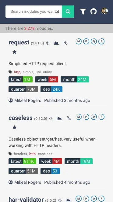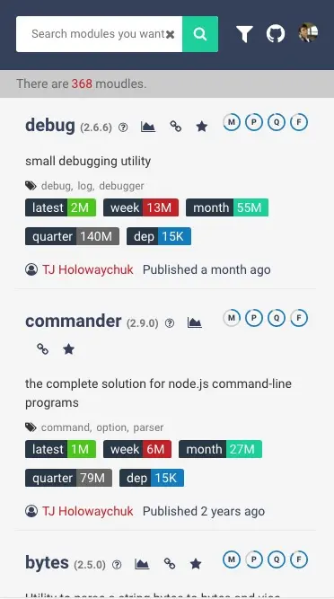 在npmjs.org中,由于一些模块的够简单,通用,一直以来都是热门模块,但是这些模块都是大家耳熟能详,express从我开始使用node.js 0.8的时候已经是大家使用较多的web framework,现在还是很火。诸如此类的模块,都是在一直排在前面,想自己慢慢去浏览发现新的模块还真的是很吃力。因此更多的排序,更多的筛选,则是我所希望的。