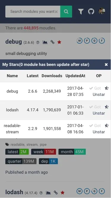 从我开始接触node.js以来,最开始选择module都是通过别人推荐的文章或者去github中的trending中刚好发现好用的模块。对于npmjs.org仅能说一直只当它来查询一下模块有没有更新,它的Most depended-upon packages(前面部分)已经翻过不少次,但是一直前面的模块都是已经了解过的,一直没有想到好的方式来筛选一下module,自己无聊的时候不知道怎么打发,所以决定自己将npmjs.org的模块同步,自己做个筛选的网站