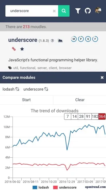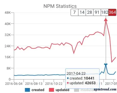 图一展示的是npm模块的总数,从图中可以看到,模块数量从一年前的28万增长到现在的46万,增长速度是很快,不过从曲线上也看出,增长率并没有很大的变化。而图二展示的是当天创建与更新的模块数,模块创建基本稳定,模块更新的数量有稳定上升的趋势(考虑到模块总数的增长,该数量的增长也算是正常范围)。更新与创建的最大值都是在2017-04-22那一周期中(7天),创建了1万多的模块,有4万多的模块发布了更新。
