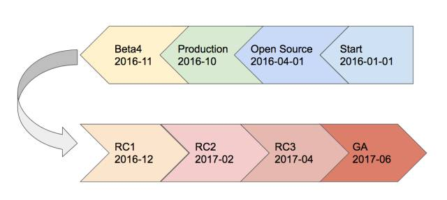 Here you can see the TiKV timeline. We first began to develop TiKV January 1st, 2016, and made it open source on April 1st, 2016, and this is not a joke like Gmail at All April Fool’s Day. TiKV was first used in production in October, 2016, when we had not even released a beta version. In November, 2016, we released the first beta version; then RC1 in December, 2016, RC2 in February, this year. Later we plan to release RC3 in April and the first GA version in June.