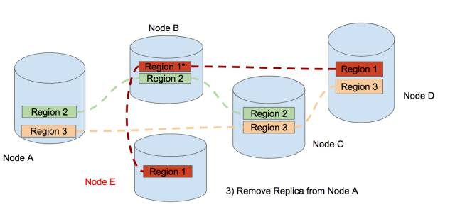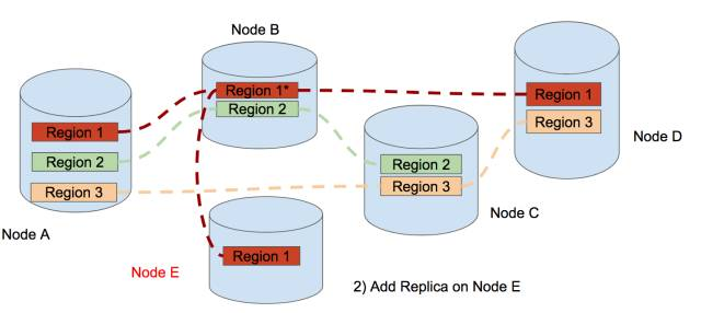 After that, the leader of region 1 is in Node B now, then we add a new replica of region 1 in Node E.