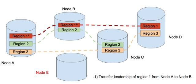 So we add a new Node E, and begin to move the region 1 in Node A to Node E. But here we find that the leader of region 1 is in Node A, so we will first transfer the leader from Node A to Node B.