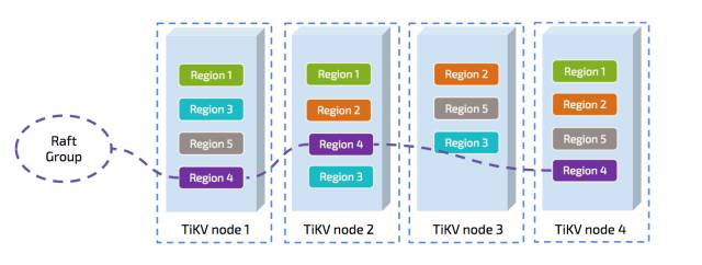 You can see that there are four TiKV nodes. Within each store, we have several regions. Region is the basic unit of data movement and is replicated by Raft. Each region is replicated to three nodes. These three replicas of one Region make a Raft group.