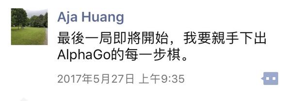 “最后一局即将开始,我要亲手下出AlphaGo的每一步棋。”人机大战最后一天的上午9:35,黄士杰在朋友圈发了这样一句话。