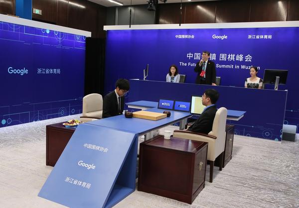 5月23日,雨从早下到晚,围棋人机大战如期举行。柯洁对面,坐着的仍是黄士杰,仍然作为AlphaGo的人肉臂代为落子。