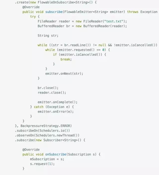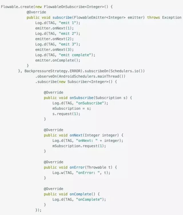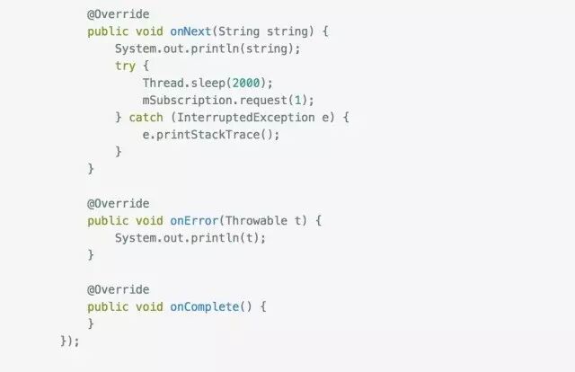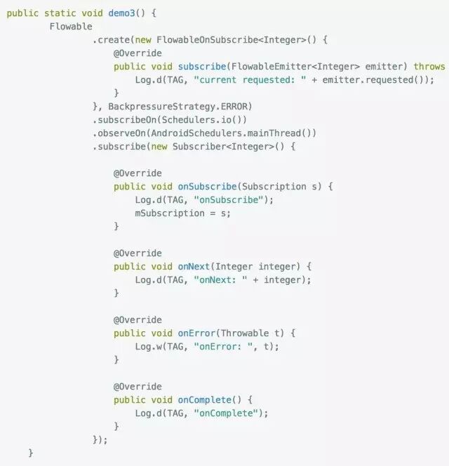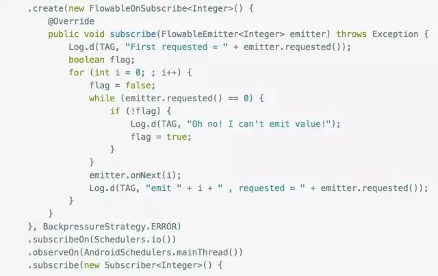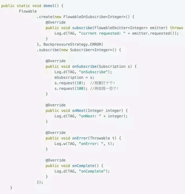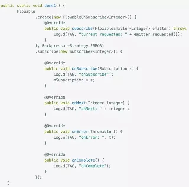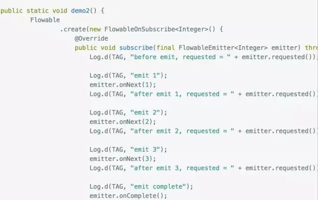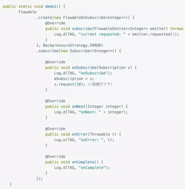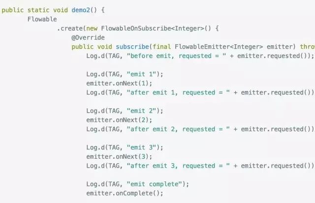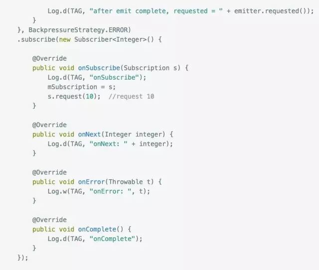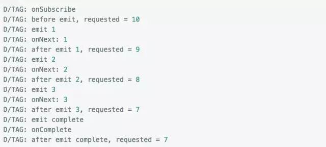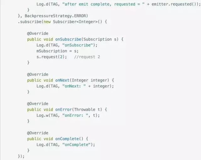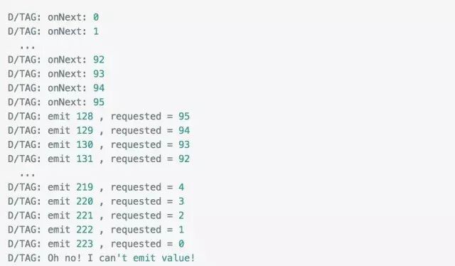大家应该能看出端倪了吧,下游调用request(n) 告诉上游它的处理能力,上游每发送一个next事件之后,requested就减一,注意是next事件,complete和error事件不会消耗requested,当减到0时,则代表下游没有处理能力了,这个时候你如果继续发送事件,会发生什么后果呢?当然是 MissingBackpressureException啦,试一试: