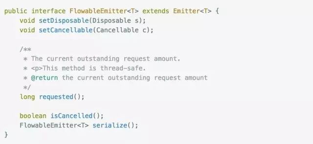 FlowableEmitter是个接口,继承Emitter,Emitter里面就是我们的onNext(),onComplete()和onError()三个方法。我们看到FlowableEmitter中有这么一个方法: