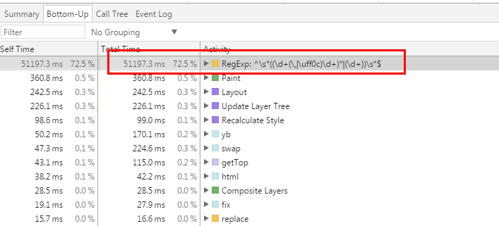 可以看出,72.% 的 CPU 时间用在了一条正则表达式上。你肯定想到了,这就是小伙伴用来检查用户输入是否合法的正则表达式。