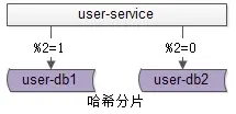 哈希法如上图:也是以用户中心的业务主键uid 为划分依据,将数据水平切分到两个数据库实例上去: