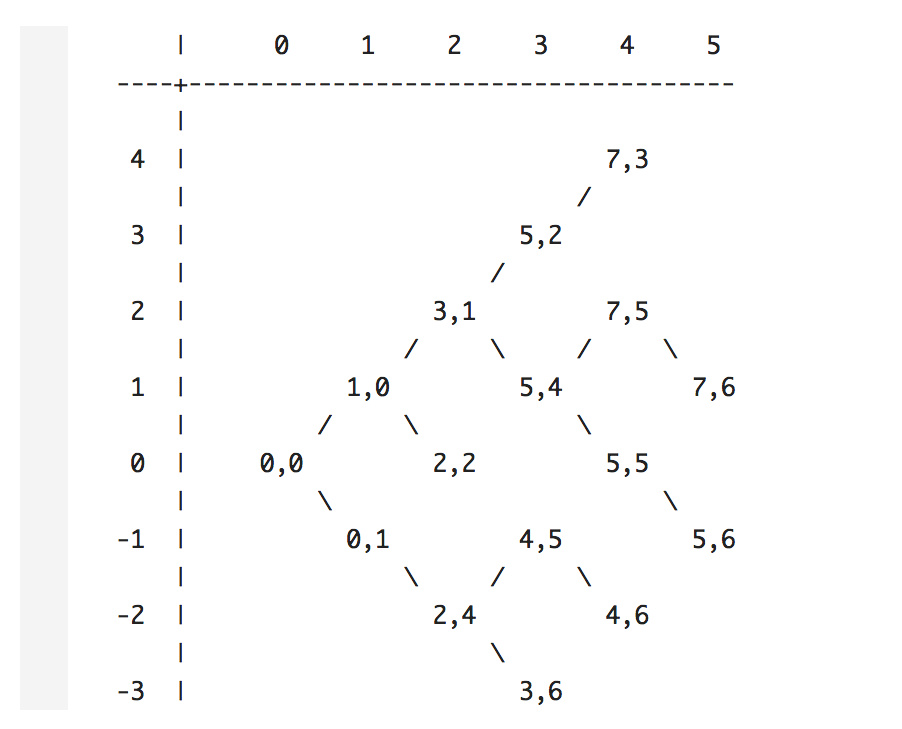 下图横轴代表d,纵轴代表k,中间是最优坐标,从这张图可以清晰的看出,当d=5,k=1时,我们到达了目标坐标(7, 6),因此,”最短的直观的“路径就是(0, 0) -> (1, 0) -> (3, 1) -> (5, 4) -> (7, 5) -> (7, 6),对应的diff如下。