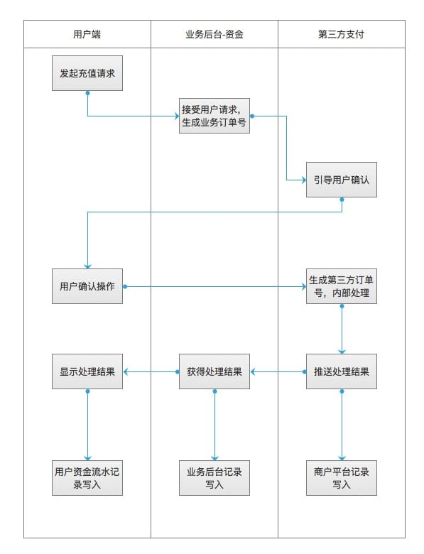 从表面上看,支付的过程是信息的流动,但其实质上是资金的流动,我们以充值为例,其信息流过程如下: