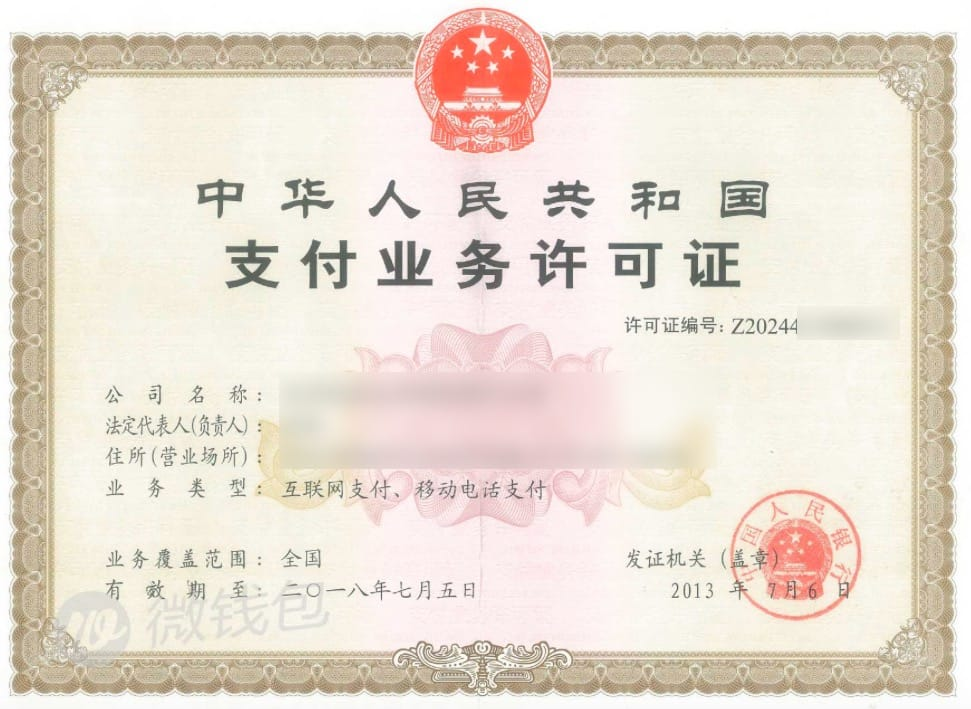 第三方支付渠道是相对于银行直连渠道来说的。指的是一些『持牌』的独立机构,居中于买卖家之间进行收付款作业的交易方式。一般情况下,由第三方支付服务提供商负责对接各个银行的直连接口,而业务方只需要直接对接第三方支付的相关接口即可完成支付业务的操作。整个交易过程为业务方—>第三方支付—>银行。相对于银行直连渠道来说,接入难度小,技术门槛低,开发速度快。目前在我国大陆地区从事第三方支付业务必须取得『支付业务许可证』。下图是某第三方支付平台的『支付业务许可证』样本。