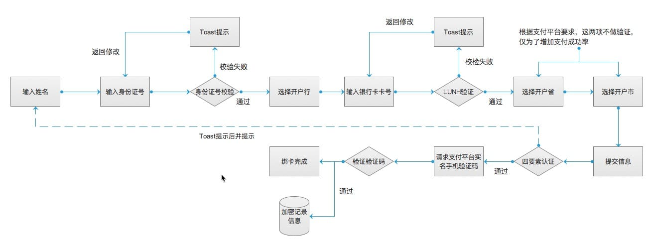 作为一个支付的必要条件,绑卡可以为后续的充值、投资、提现来做准备。一般情况下绑卡需要进行三要素或者四要素验证。同时在用户输入卡号的时候可以先进行卡号的验证,减少绑卡失败却需要付手续费的情况,同时也让用户的体验更好。绑卡的流程图如下(以MY理财的新浪支付资金托管“实名+绑卡”为例,做的比较糙,大家见谅):
