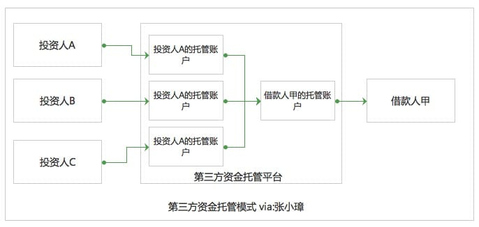 『哪里有需求,哪里就有市场』,随着通道模式暴露出来的资金池问题越来越严重,一些第三方支付平台开始推出了『资金托管』服务。在此模式下,用户(投资人和借款人)需在第三方支付机构虚拟二级账户,每个独立账户都是独立的,投资人先把钱充到其在第三方支付上的账户里,当进行投资交易时,第三方支付把投资人的钱直接拨到借款人账户,用户的资金全程由第三方支付负责托管,并开设独立专用账户,实现专款专用,与平台自由资金完成分离,避免资金池的风险。