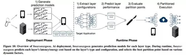 在DNN模型的运行时,Neurosurgeon就能够动态地找到最佳的分割点。首先,它会分析DNN模型中各网络层的类型和参数情况并执行之,然后利用预测模型来预测各网络层在移动设备和云服务器上的延迟时间和电量消耗情况。根据所预测的结果,结合当前网络层自身及数据中心的负载情况,Neurosurgeon选择出最佳的分割点,调整该分割点能够实现端到端延迟时间或者电量消耗的最优化。