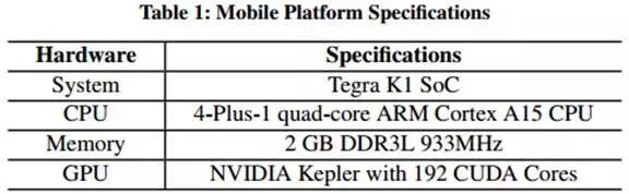 最新的SoC芯片让人印象深刻。这篇论文使用了NVIDIA的Jetson TK1平台(拥有4核心的ARM处理器和一个Kepler GPU)(如下表1),数十万个设备的组合的计算量是惊人的。