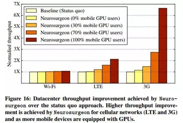 上图16表明,在移动设备使用Wi-Fi网络的条件下,Neurosurgeon所带来的的数据吞吐量是现有方法的1.04倍。而随着连接网络质量的变差,Neurosurgeon会让移动设备承担更多的计算量,此时云服务器上数据中心的吞吐量将增加:较现有方法,连接LTE网络的情况下数据中心的吞吐量增加至1.43倍,而3G网络条件下则增加至2.36倍。