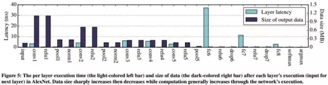 一种直观的切分方法是基于DNN中网络层作为边界。以AlexNet为例,如果我们能够计算出每一层的输出数据量和计算量,将得到如下的统计图(下图5):