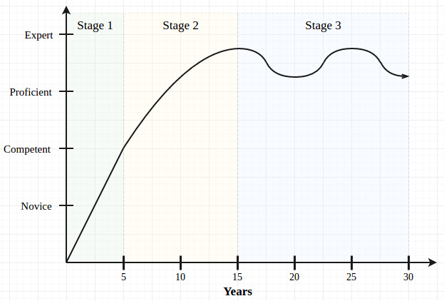 我正处于第三阶段。我还是很喜欢学习,但我明白,不努力的话,我可能会一直保持在“专家”的平衡状态边缘。