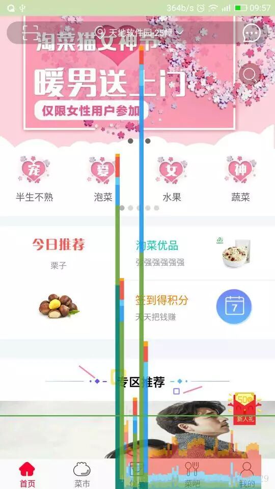 随着界面的刷新,界面上会以实时柱状图来显示每帧的渲染时间,柱状图越高表示渲染时间越长,每个柱状图偏上都有一根代表16ms基准的绿色横线,每一条竖着的柱状线都包含三部分(蓝色代表测量绘制Display List的时间,红色代表OpenGL渲染Display List所需要的时间,黄色代表CPU等待GPU处理的时间),只要我们每一帧的总时间低于基准线就不会发生UI卡顿问题(个别超出基准线其实也不算啥问题的)。就简单的看下我们公司项目刚启动的时候: